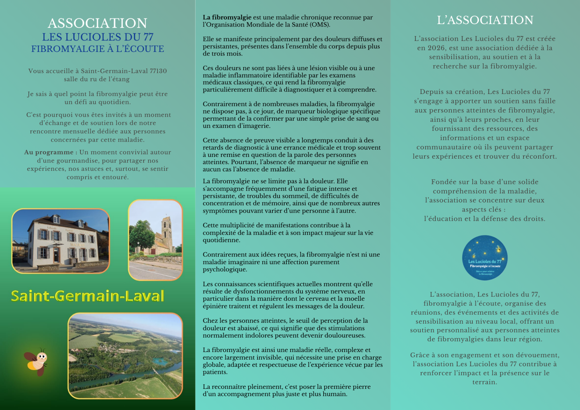 La mission principale des Lucioles du 77 est de soutenir, informer et rompre l’isolement des personnes atteintes de fibromyalgie. Nous œuvrons également à sensibiliser le grand public à cette maladie encore méconnue. Nous avons créé cette association pour offrir un espace d’écoute, de solidarité et de compréhension, afin que personne ne reste seul face à la douleur et à l’incompréhension. Notre objectif : apporter de la lumière, du lien et de l’espoir à celles et ceux qui en ont besoin.